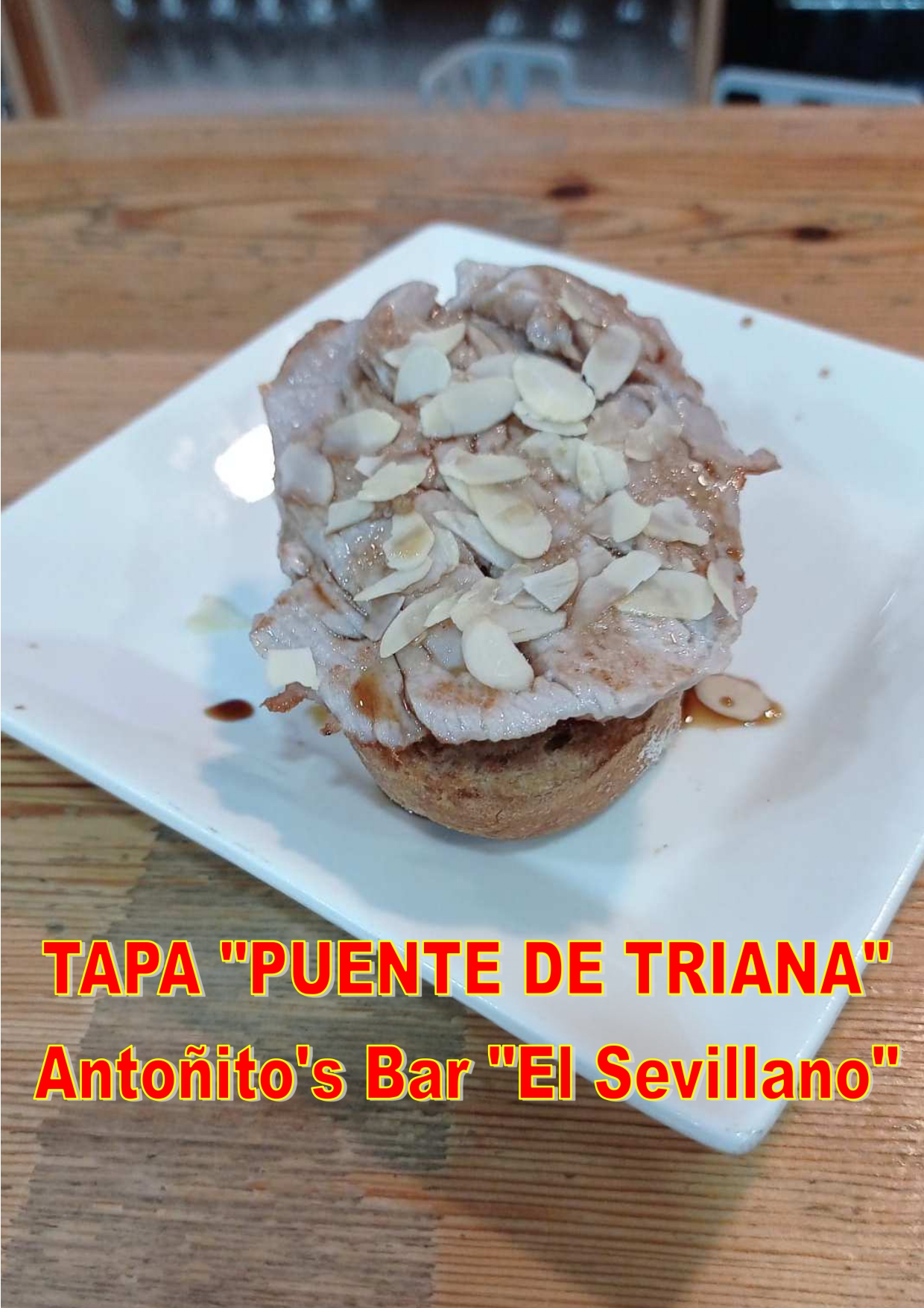 - BAR ANTOÑITO’S EL SEVILLANO. TAPA «PUENTE DE TRIANA» Tosta de pimiento asado, solomillo de cerdo al Pedro Ximenez con almendra laminada. Av. Cataluña 15 (plaza del Dragón)