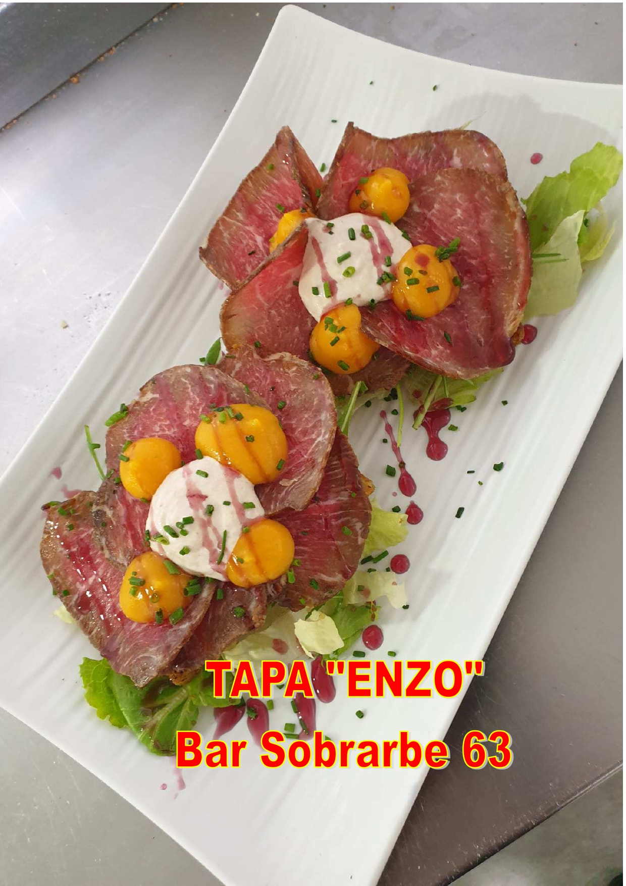 - BAR RESTAURANTE SOBRARBE 63. TAPA «ENZO». Flor de carpacio en pan de coca con salsa Vitelo Donato y boniato a la naranja