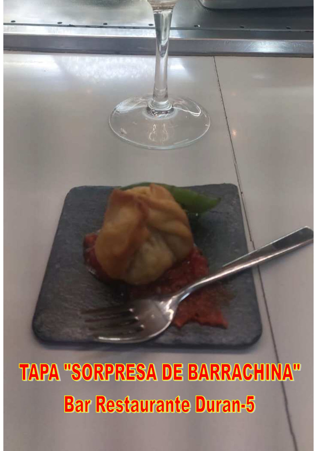 - RESTAURANTE DURAN-5. TAPA «Sorpresa de Barrachina». Saquito hojaldrado de pollo con pimiento y confitura de tomate. Av. San Juan de la Peña 14