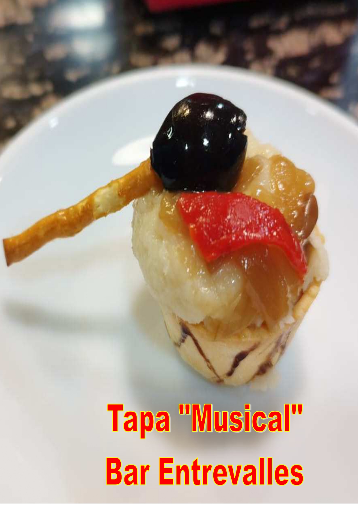 - BAR ENTREVALLES. TAPA «MUSICAL». Croqueta desestructurada con pimiento, cebolla caramelizada, aderezada con aceituna negra en palito de pan. C/ Valle de Oza 2