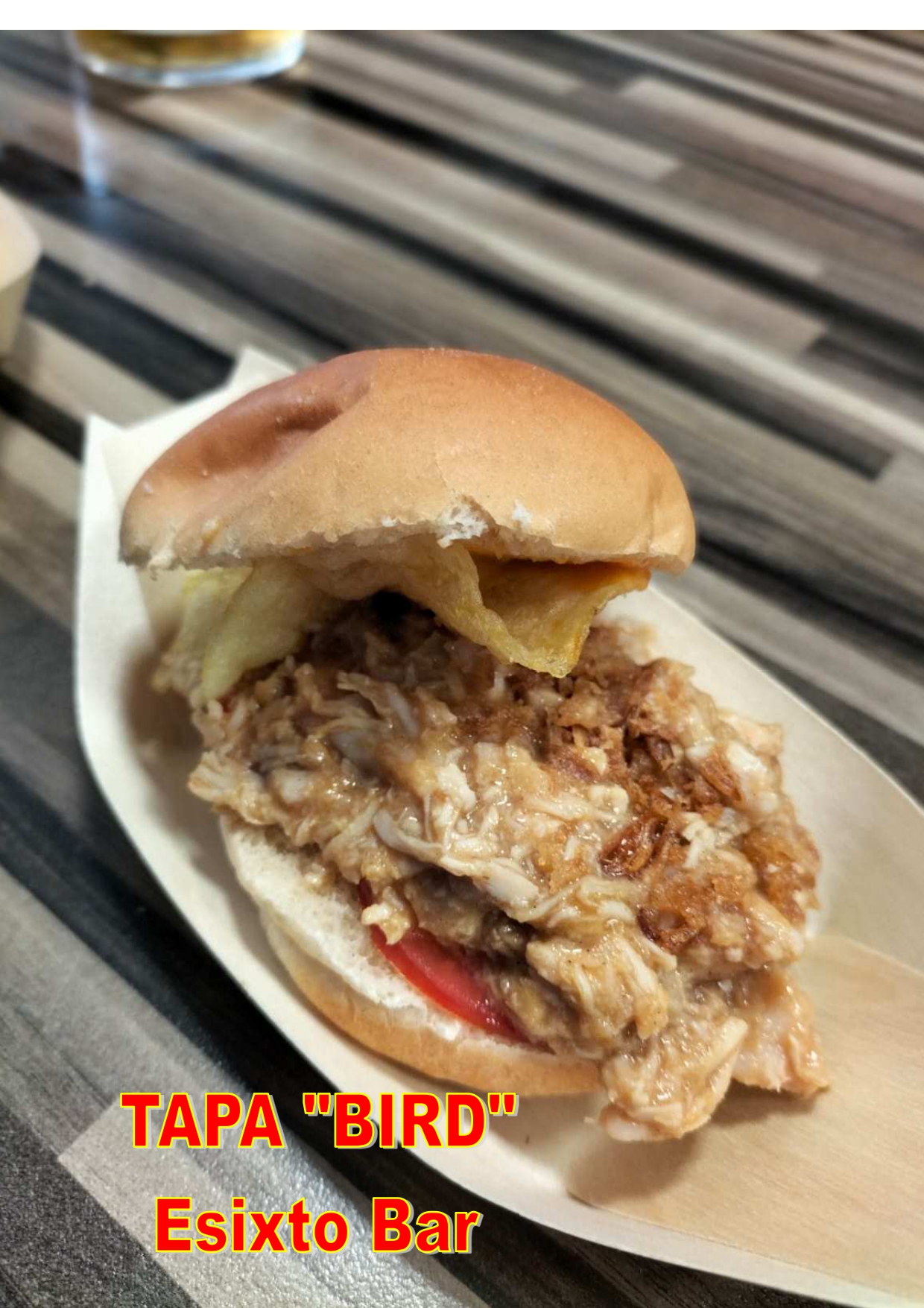 - BAR ESIXTO. TAPA «BIRD». Mini hamburguesa de pollo deshuesado con salsa de queso chedar semi picante, tomate, pepino y crujiente sorpresa. C/ Sixto Celorrio 16-18.