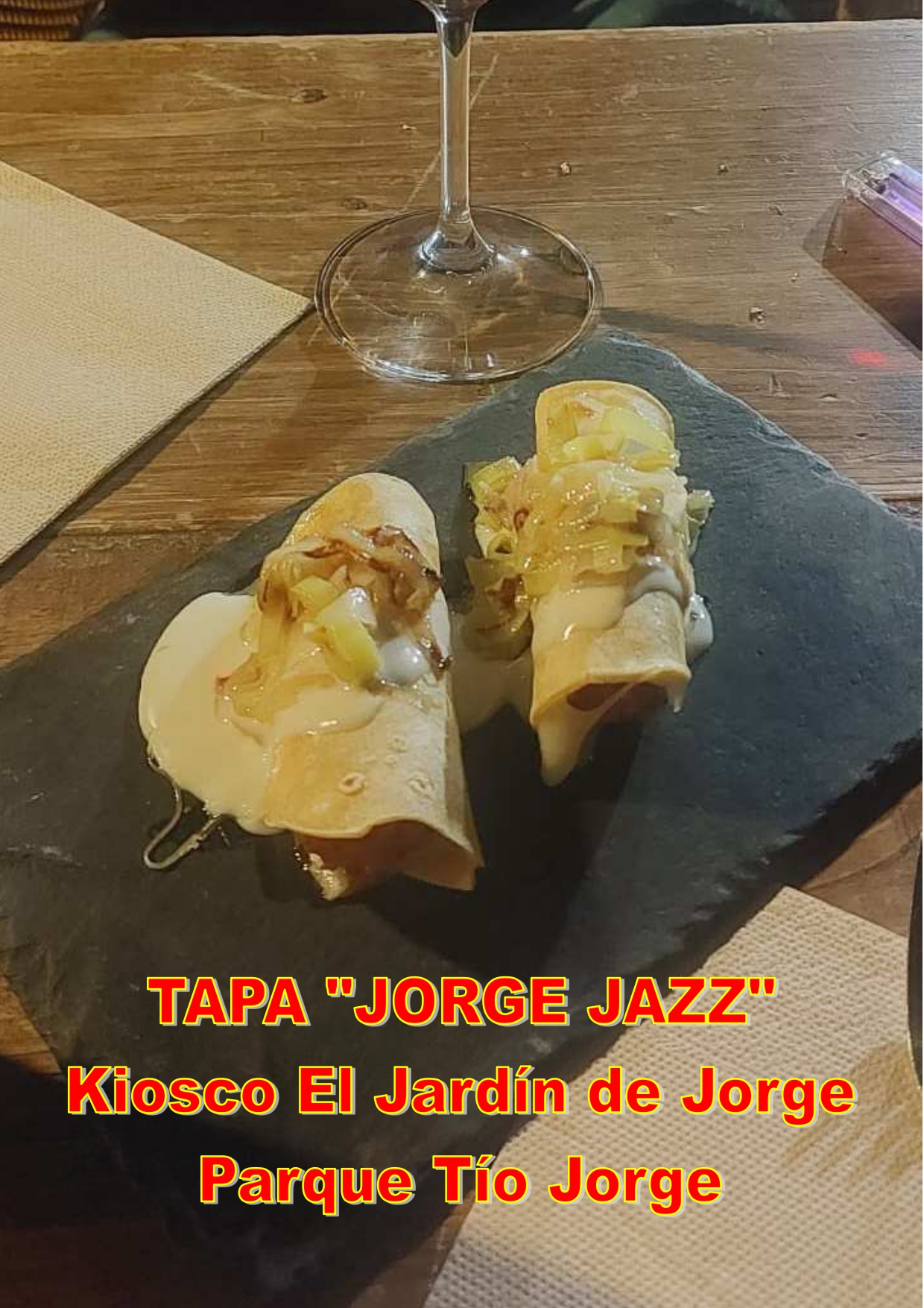- KIOSCO EL JARDIN DE JORGE. TAPA «JORGE JAZZ». Tortilla de maiz con chistorra, puerro confitado y salsa de queso roquefort. Parque del Tío Jorge, junto cancha baloncesto