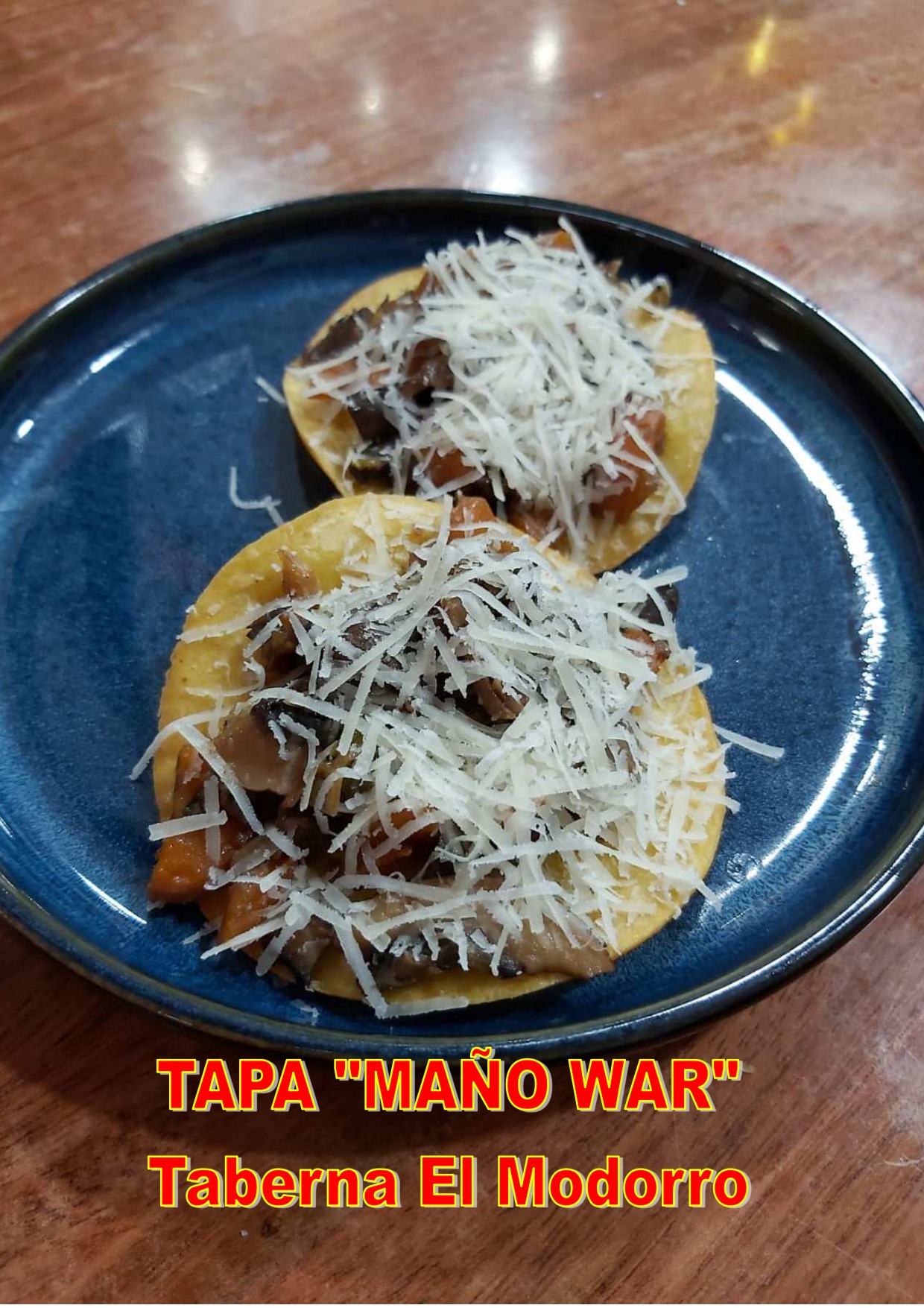 - TABERNA EL MODORRO. TAPA «Maño War». Tosta de pan de maiz con boletus, crema de borraja y queso parmesano.. C/ Valle de Zuriza 15