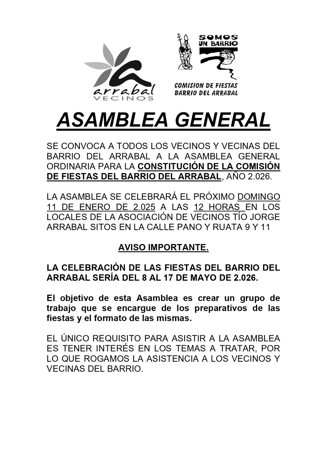 Se convoca a todos los vecinos y vecinas del barrio del Arrabal a la Asamblea General Ordinaria para la constitución de la Comisión de Fiestas del barrio del Arrabal del año 2026.