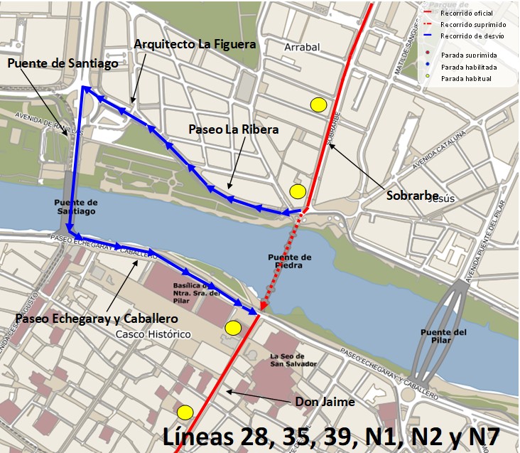 En el caso de las líneas 28, 35, 39, N1, N2 y N7, el desvío se realizará desde Sobrarbe – Avenida Cataluña/Balcón de San Lázaro por Paseo La Ribera, Arquitecto La Figuera, Avenida Pirineos, Puente de Santiago, Echegaray y Caballero hasta Don Jaime. Además, la línea 39 mantendrá su desvío adicional por el corte de Plaza San Miguel, circulando por Echegaray.
